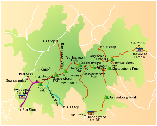 The traditional course runs east to west Daewon-sa to Hwaeom-sa which experienced hikers can complete in three days.